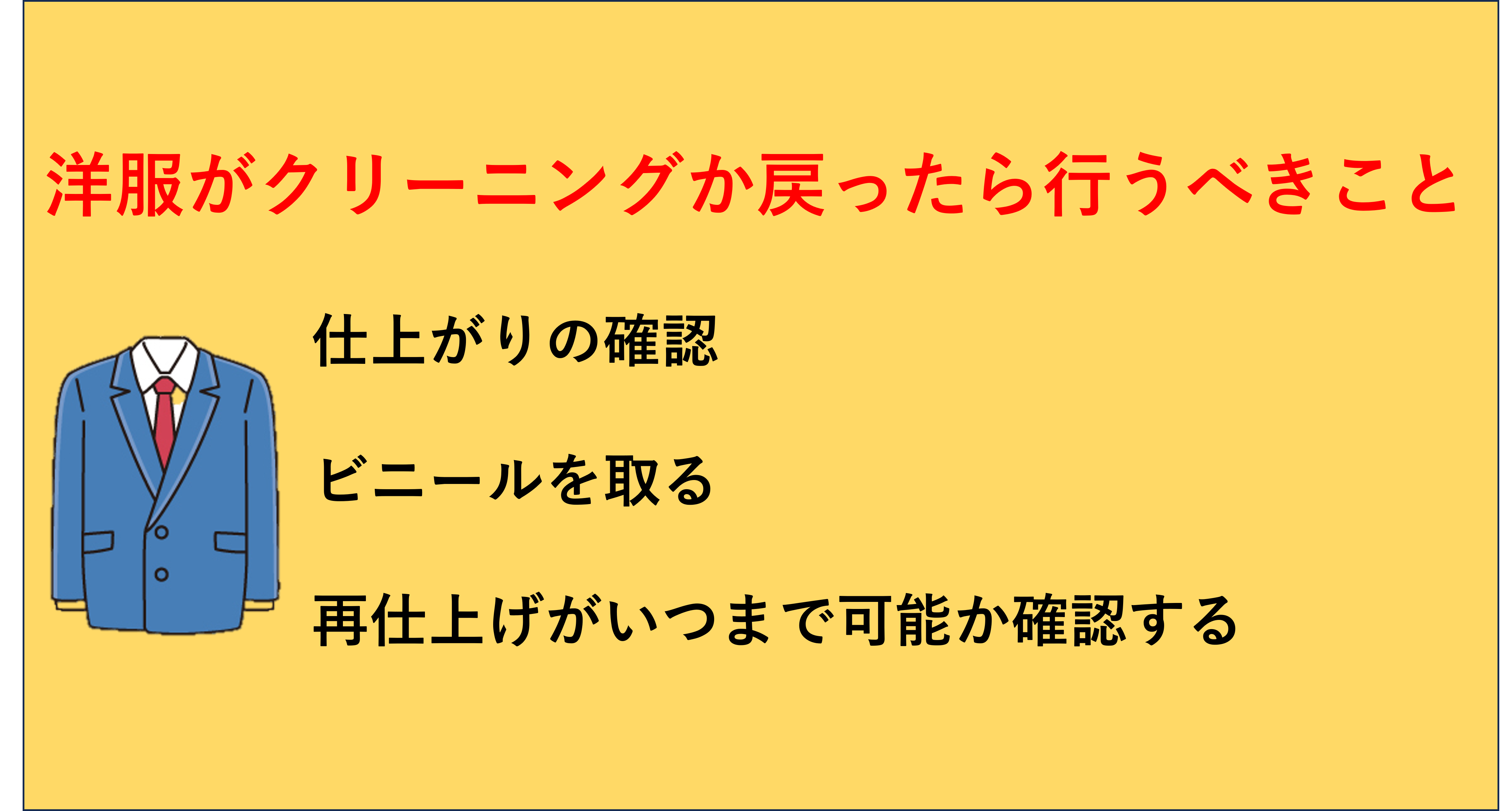 返却された洋服を確認した際に、染みや汚れが落としきれていない場合は再仕上げを依頼しましょう。