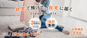 クリーニングキットは、福岡市博多区と春日市に工場があるクリーニング店で、博多区、南区、春日市、那珂川町、大野城市が集荷対応地域となっています。