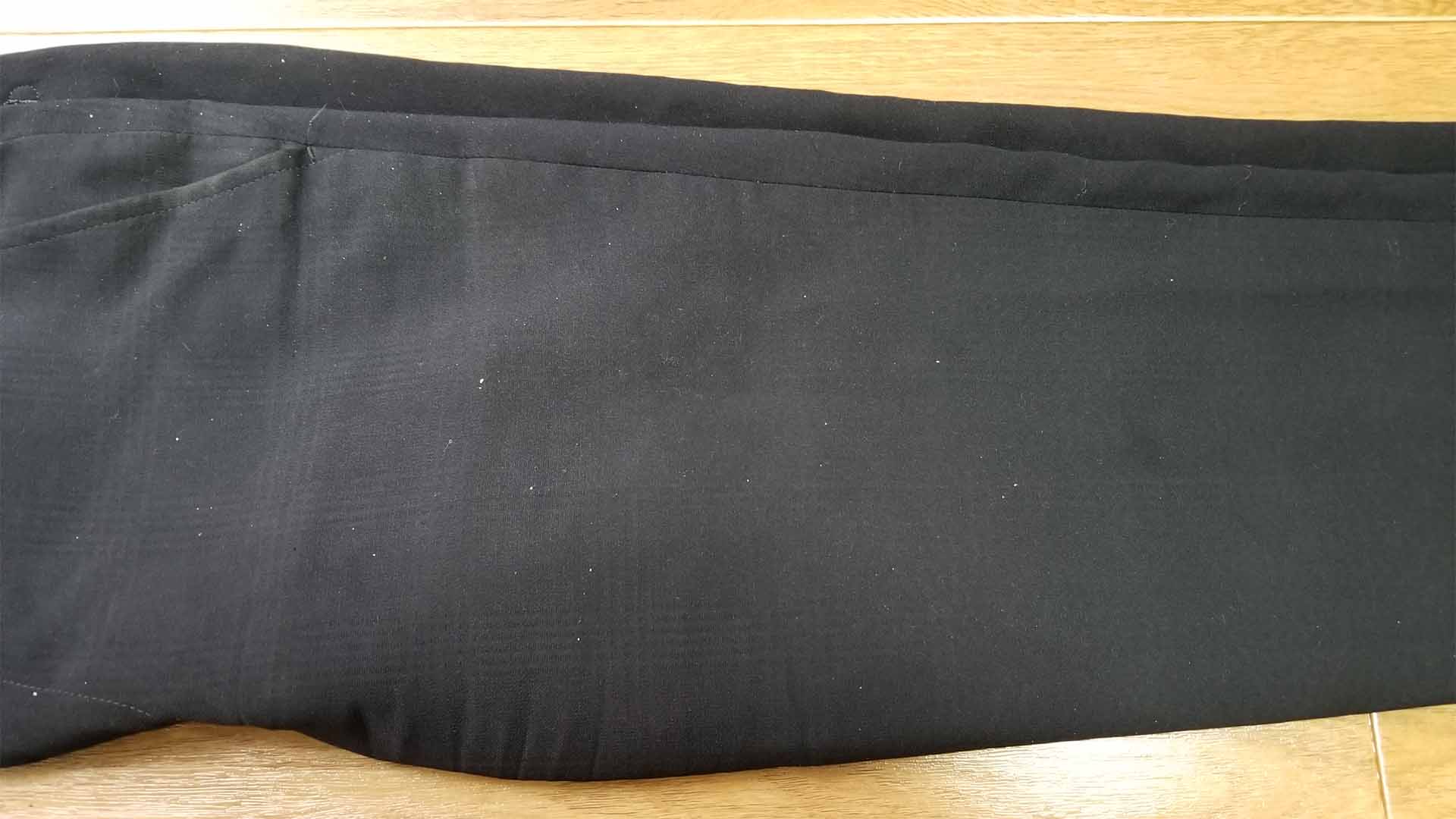 白い汚れは残っていますが、全体的にホコリが取れています。また、クリーニング前のスラックスにはなかった「センタープレス」ができています。