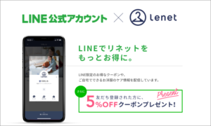 リネットの運用するLINEアカウントをお友達追加すると、5%OFFクーポンがプレゼントされます。LINEでお友達追加するだけでもらえるため、入手難易度の低いクーポンです。